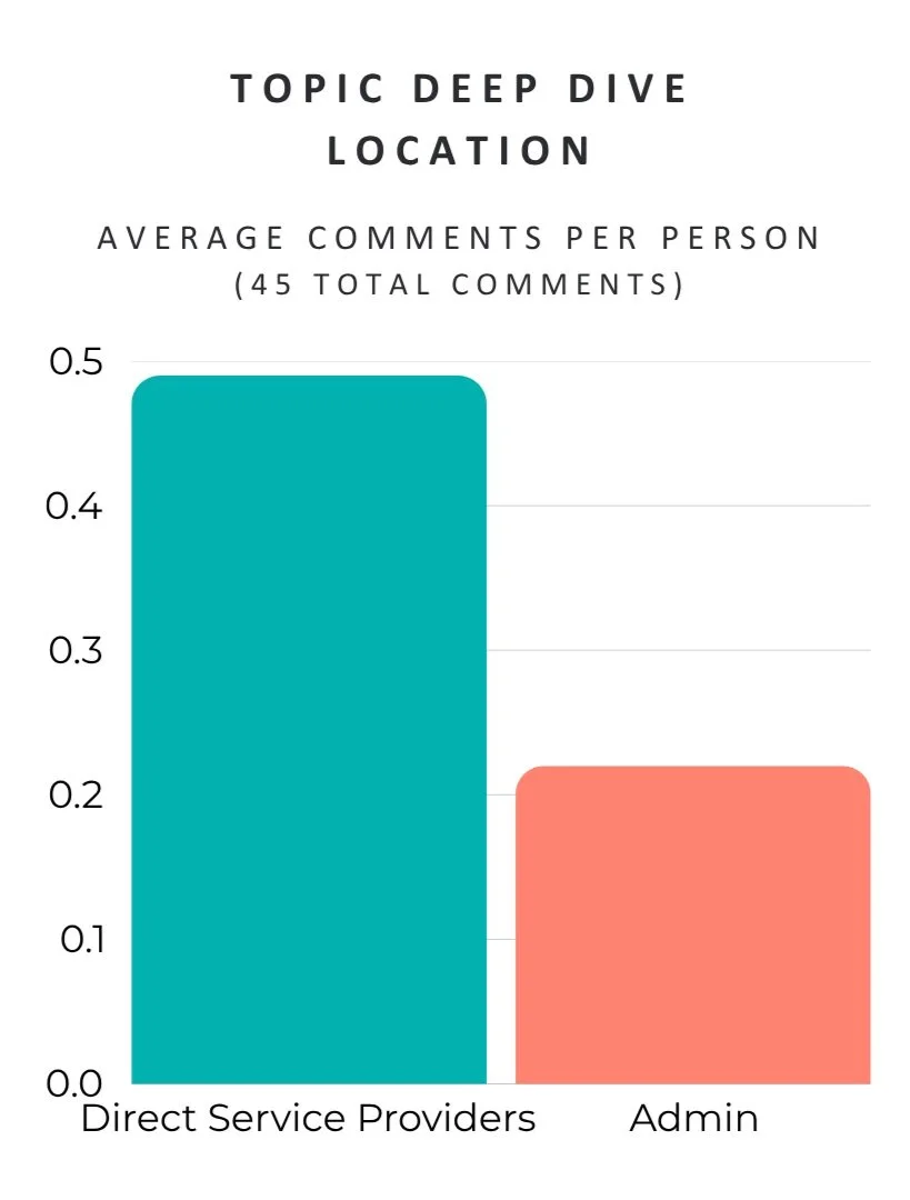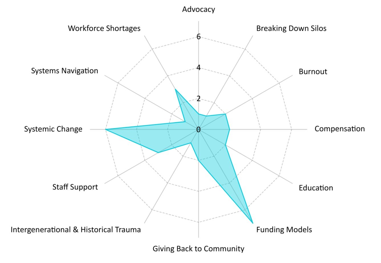Most of the challenges associated with physical location are connected to other root causes like funding models and workforce shortage. Thus, focus group participants did not have specific calls to action on this topic. The chart below shows how Location is connected to other topics. The numbers show how often the topics were discussed together. To solve issues related to location, these topics must be addressed first.